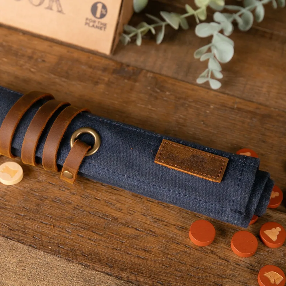 Matériaux : toile waxée déperlante, détails en cuir (plateau), bois coloré (pions).