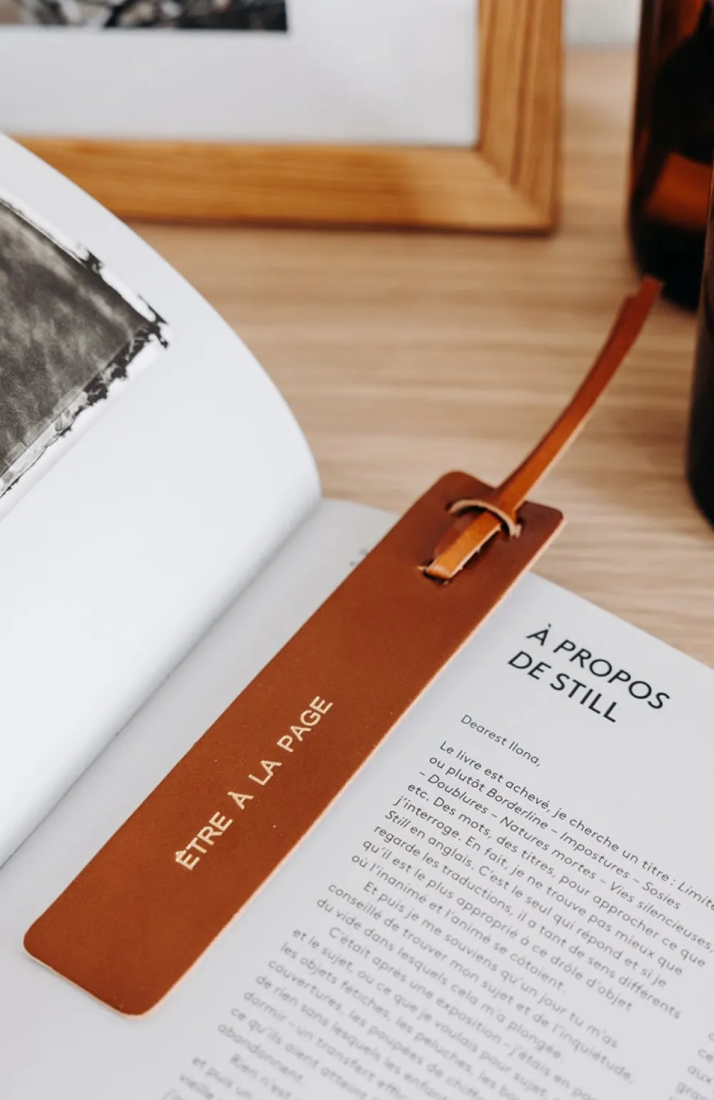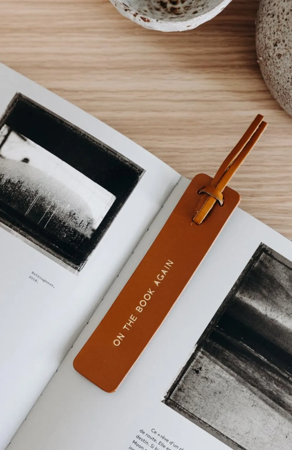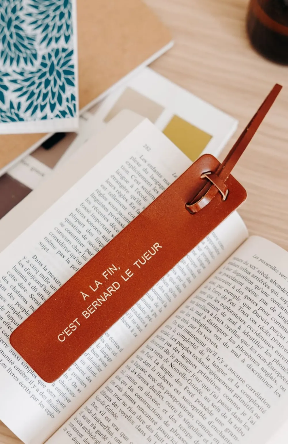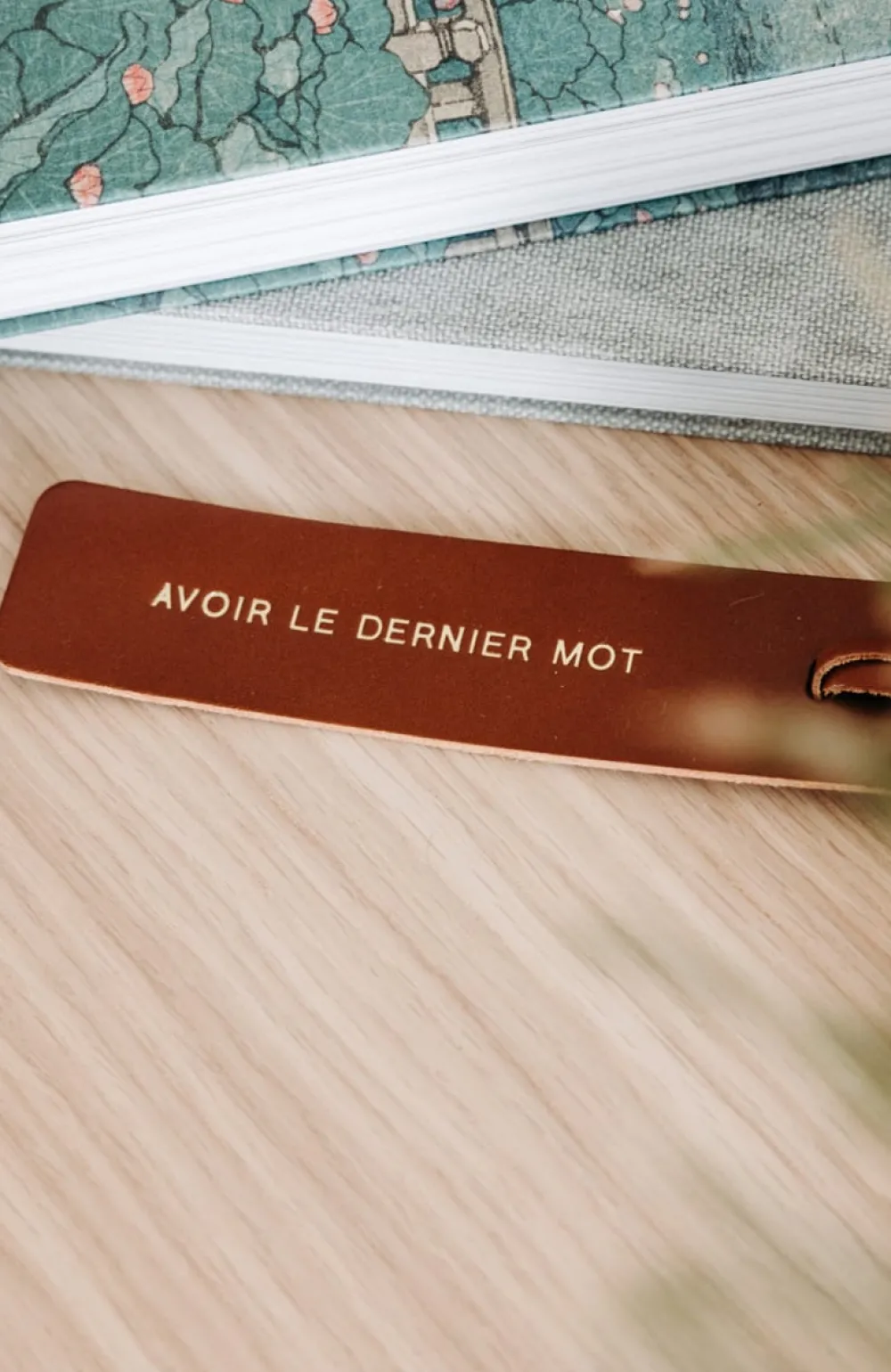 Un marque-page en cuir au tannage végétal, gravé d’un message doré.