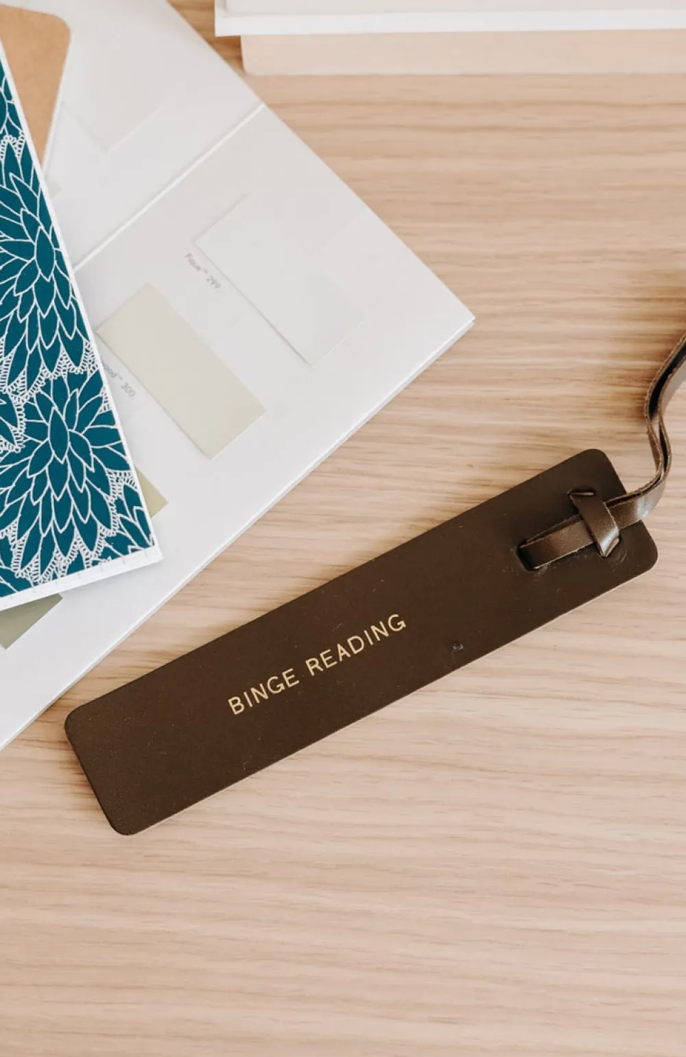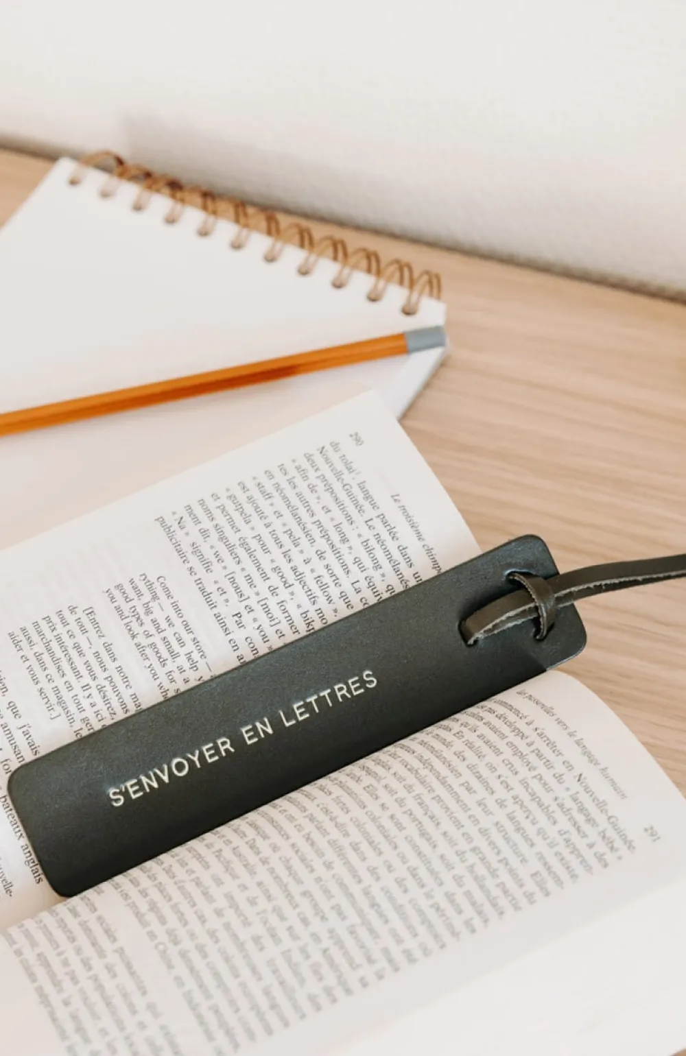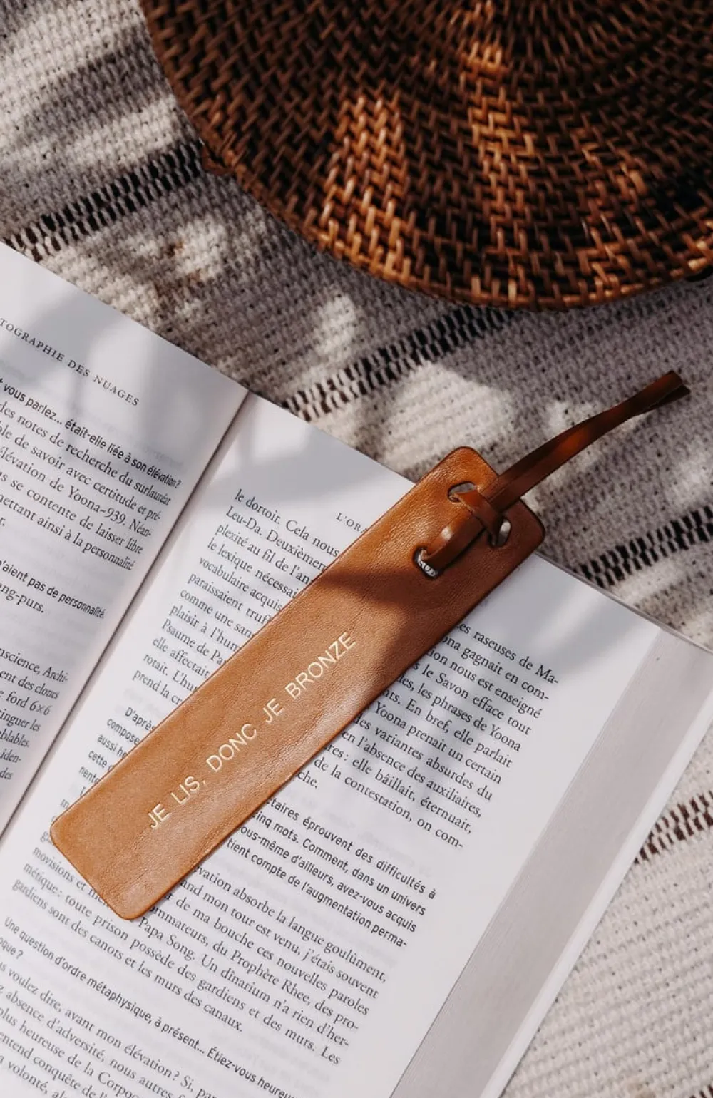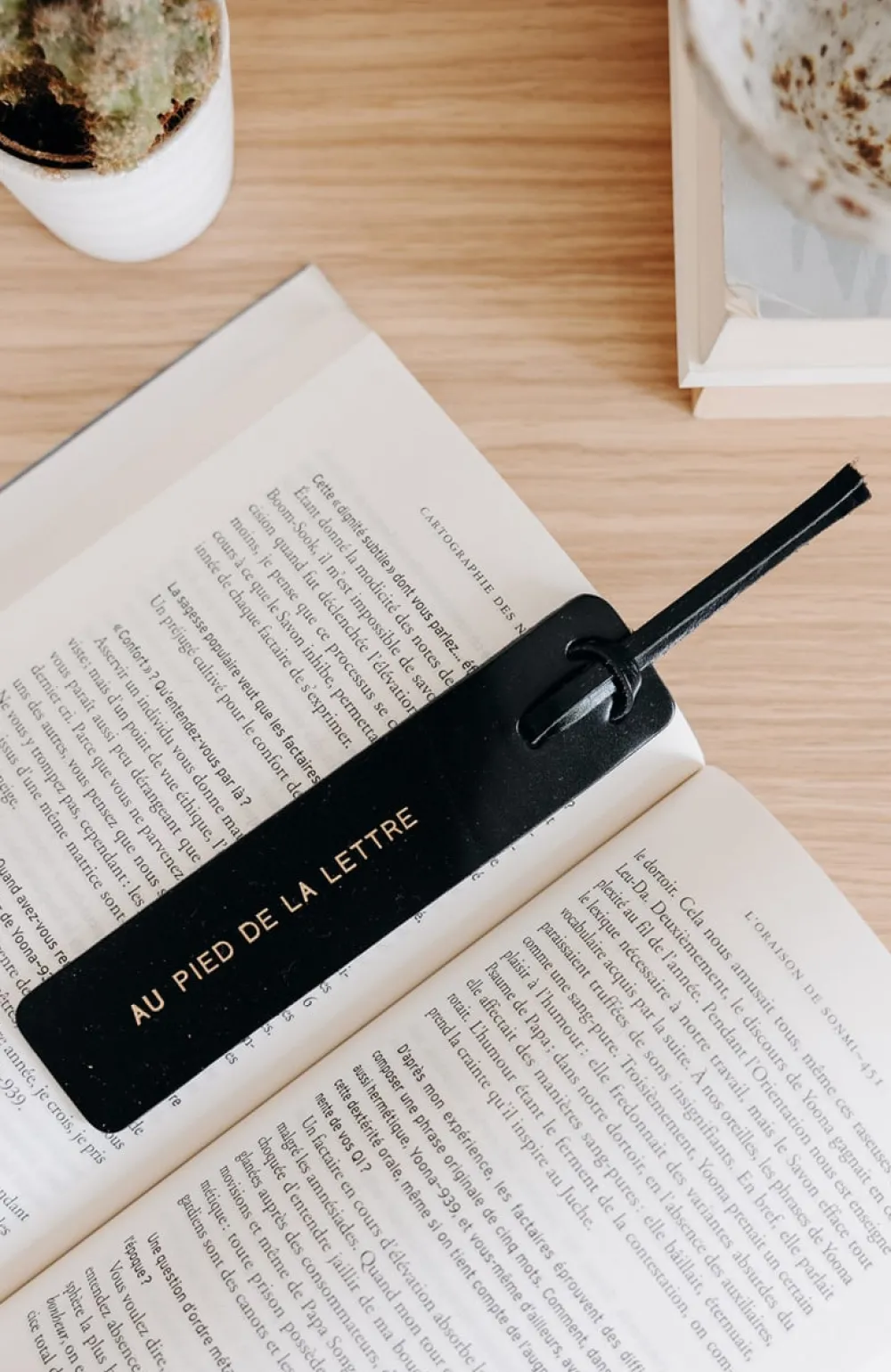 Un marque-page en cuir au tannage végétal, gravé d’un message doré.