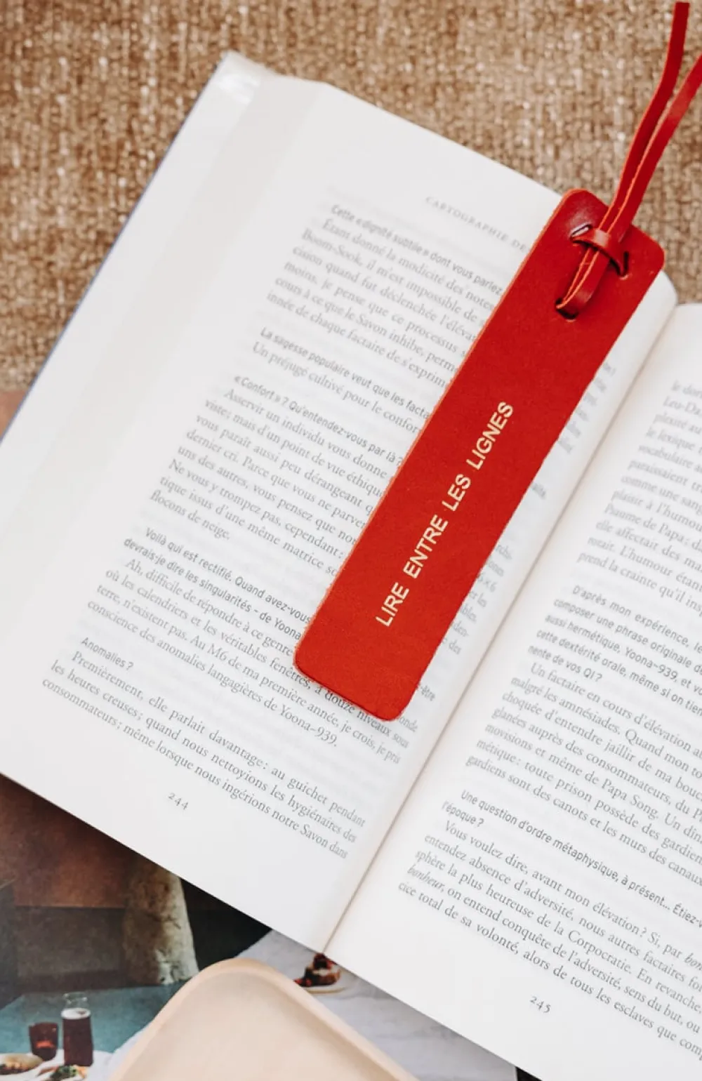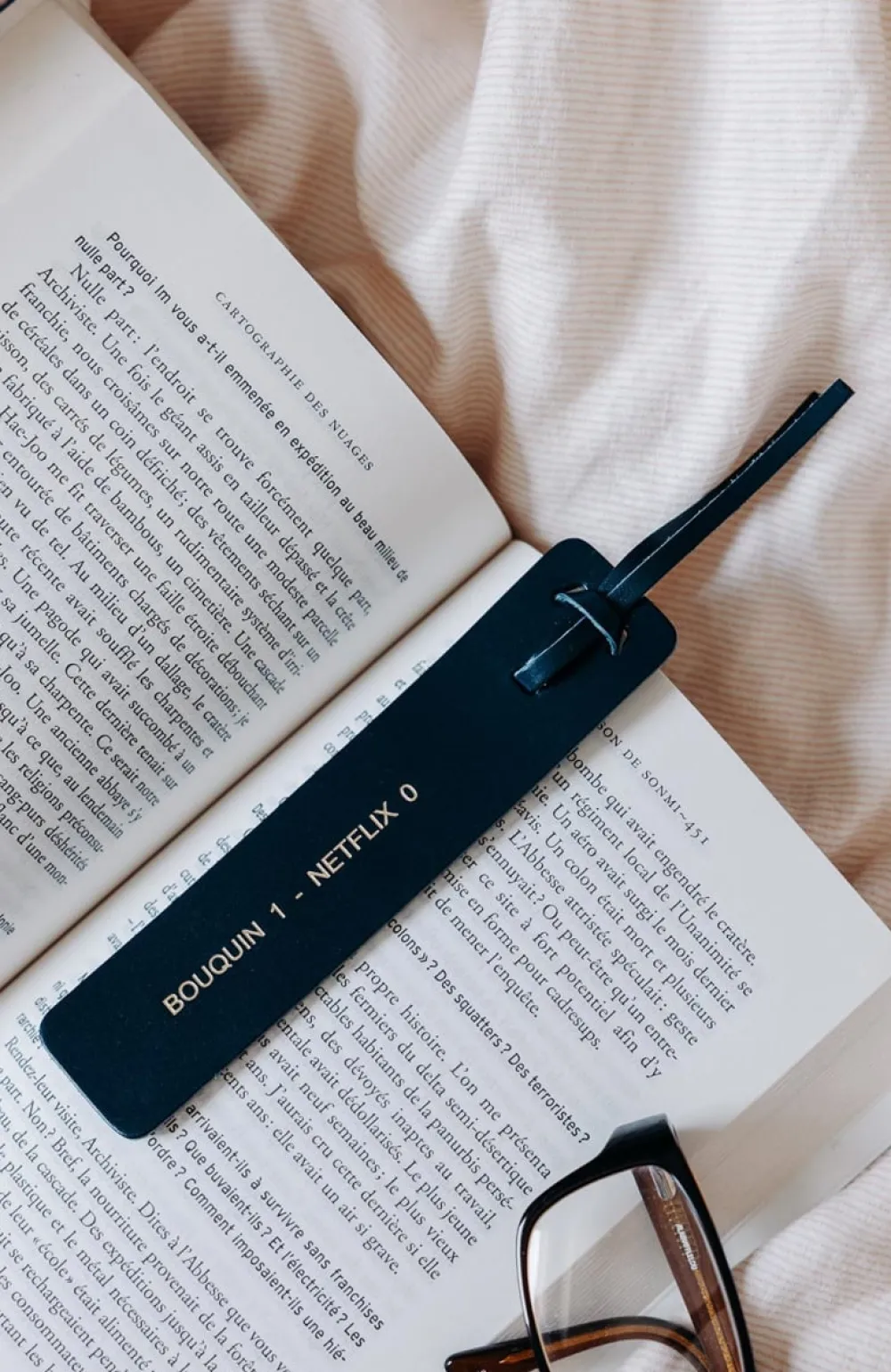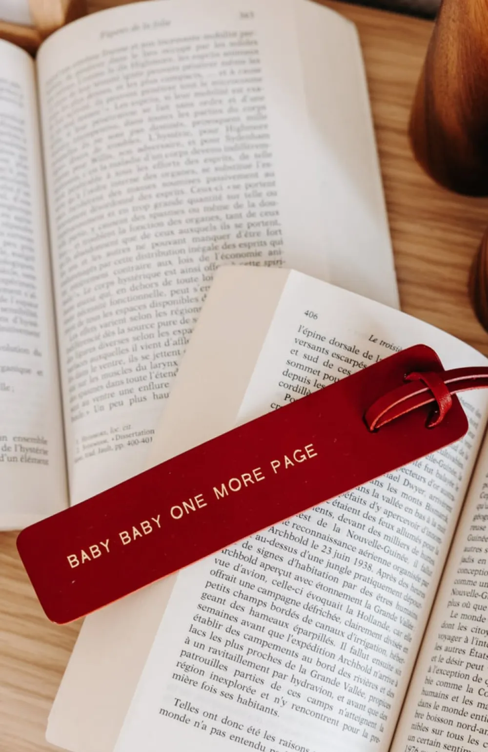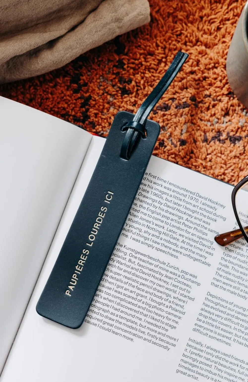 Un marque-page en cuir au tannage végétal, gravé d’un message doré.
